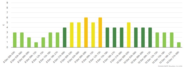 "Günəşdə bir neçə oblastda Yerə demək olar ki, təsiri olmayan C sinif alışmaları baş verıb. Hazırda Yerə istiqamətlənmiş tac kütlə atılması yoxdur. Əvvəlki alışmaların tarixcəsinə və Günəş səthində dəyişən aktiv oblastların potensialına əsasən, 8 - 10 dekabr tarixlərində M (R1/R2 - mülayim-orta) və X (güclü) alışmaların baş verəcəyi ehtimal olunur. Dekabrın 8-də dekabrın 4-də Günəşi tərk edən tac kütlə atılmasının sürüşkən təsiri müşahidə oluna bilər. Dekabrın 9-da baş verəcək təsir isə dekabrın 6-da Günəşi tərk etmiş tac kültə alışmalı ilə bağlı olacaq. Nəticədə geomaqnit aktivliyi göstərən Kp əmsalı orta coğrafi enliklərdə dekabrın 8-də 1-4, dekabrın 9-da nisbətən yüksək olmaqla 5-6 və sonrakı tarixlərdə normal 2-4 intervalında olacaq. Yüksək coğrafi enliklərdə dekabrın 8-də Kp əmsalı 2-4, dekabrın 9-da 5-7, dekabrın 10-da isə 5-6 intervalında olacaq.