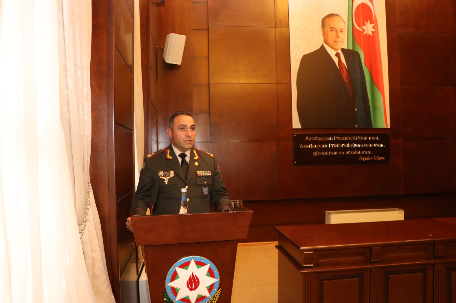 Azərbaycan Respublikası Baş prokurorunun müavini – Azərbaycan Respublikasının Hərbi prokuroru Bəhruz Əhmədov çıxış edərək dövlət müstəqilliyimizin banisi, müasir Azərbaycan dövlətinin qurucusu, xalqımızın Ümummilli lideri Heydər Əliyevin öz siyasi dühası ilə xalqımızın taleyində silinməz izlər qoymasından, onun Azərbaycana rəhbərlik illərində həyatın bütün sahələrinin intibah dövrünü yaşamasından danışıb.