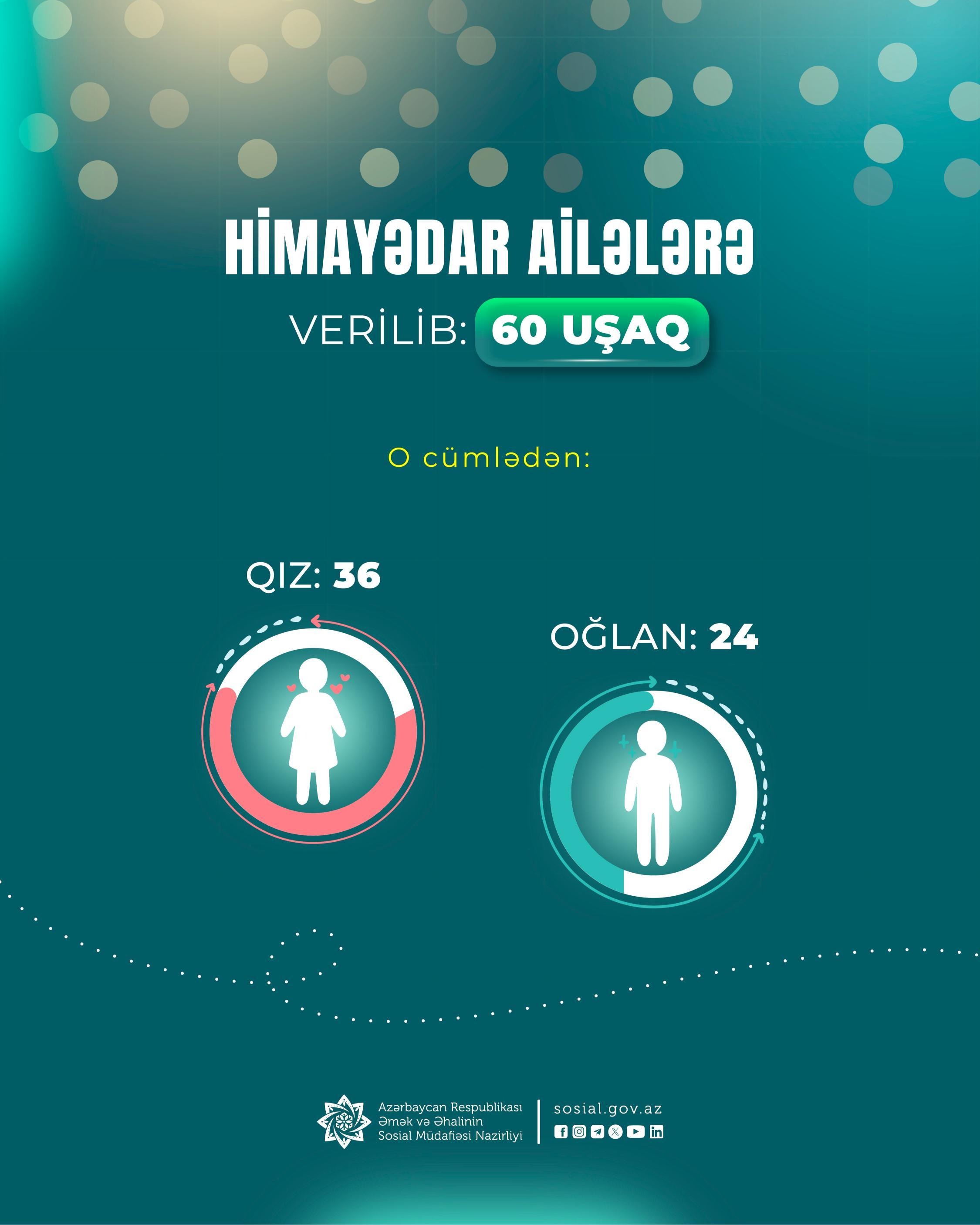 Əmək və Əhalinin Sosial Müdafiəsi Nazirliyinin tabeliyində Sosial Xidmətlər Agentliyi tərəfindən ötən dövrdə himayədar ailələrə verilən uşaqların sayı 60-a çatıb.