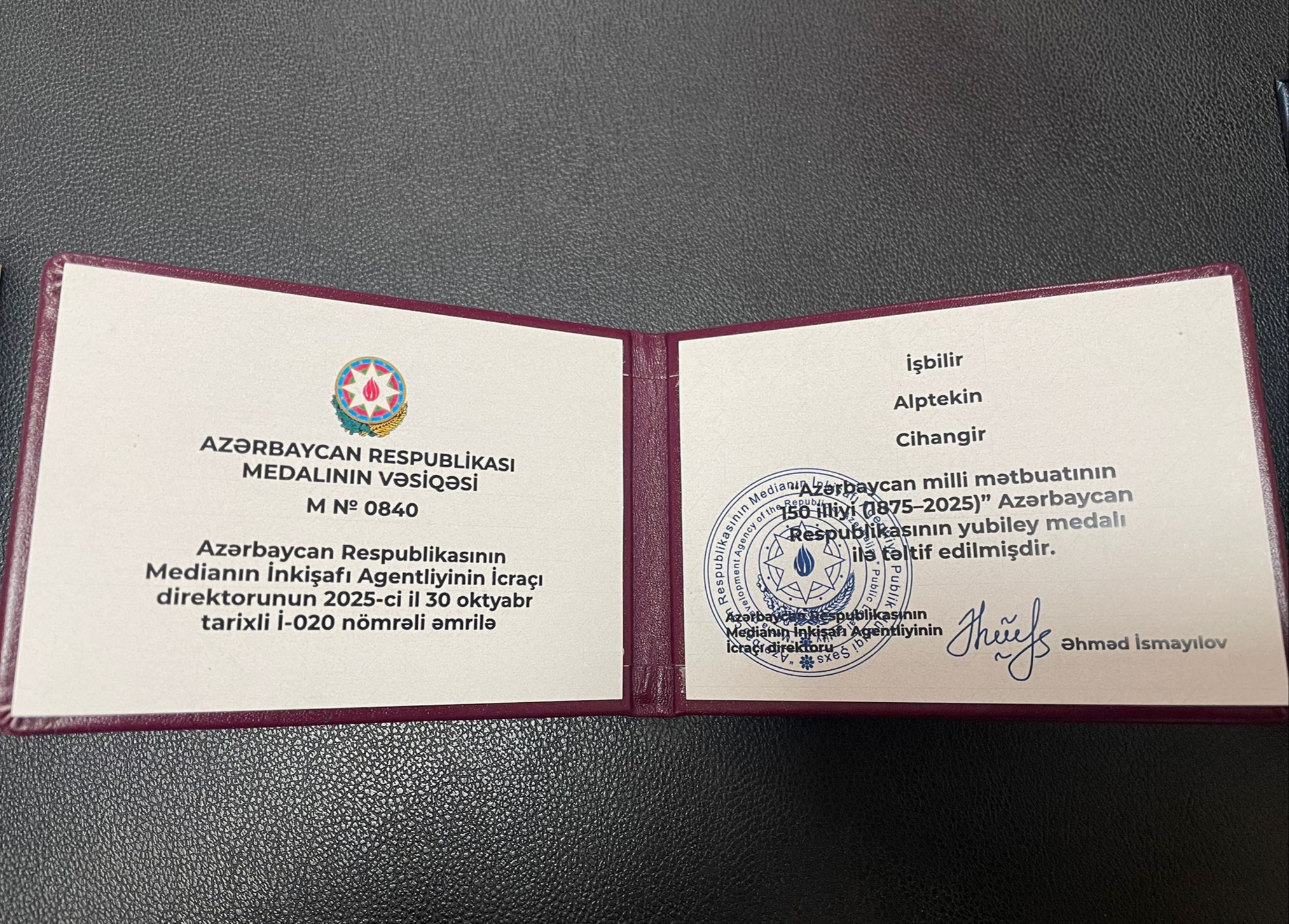 Türkiyənin Azərbaycandakı səfirliyinin mətbuat müşaviri Alptekin Cihangir İşbilir "Azərbaycan milli mətbuatının 150 illiyi (1875–2025)" Azərbaycan Respublikasının yubiley medalı ilə təltif edilib.