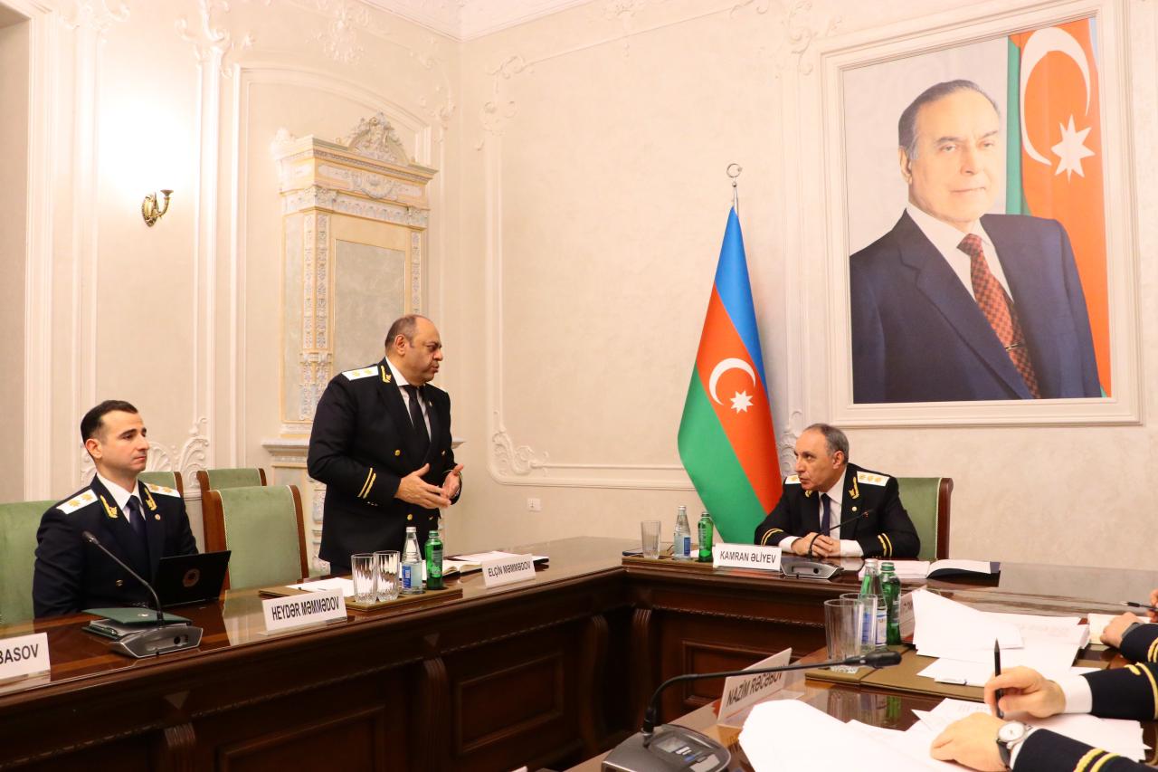 Prokurorluq orqanlarının fəaliyyətinə toxunarkən Kamran Əliyev tərəfindən ölkəmizdə bərqərar olmuş ictimai-siyasi sabitliyin qorunması, cinayətkarlığa qarşı mübarizənin gücləndirilməsi və insan hüquq və azadlıqlarının müdafiəsi sahəsində Azərbaycan prokurorluğunun rolu qeyd edilməklə, prokurorluğun əsas fəaliyyət istiqamətləri üzrə görülən işlər və statistik göstəricilər kollegiya üzvlərinin diqqətinə çatdırılıb, ümumən qeydə alınmış cinayətlərin sayında azalmanın müşahidə edildiyi, bu nailiyyətlərin əldə olunmasında digər hüquq mühafizə orqanları ilə əlaqəli şəkildə həyata keçirilən preventiv, operativ və istintaq tədbirlərinin effektivliyi vurğulanıb.
