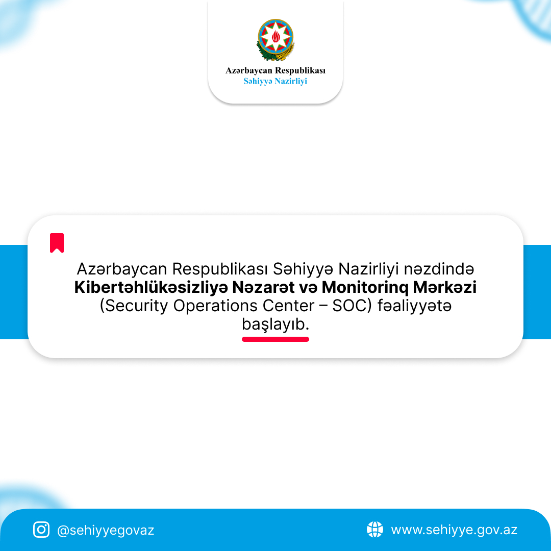 Azərbaycan Respublikası Səhiyyə Nazirliyi nəzdində Kibertəhlükəsizliyə Nəzarət və Monitorinq Mərkəzi fəaliyyətə başlayıb.