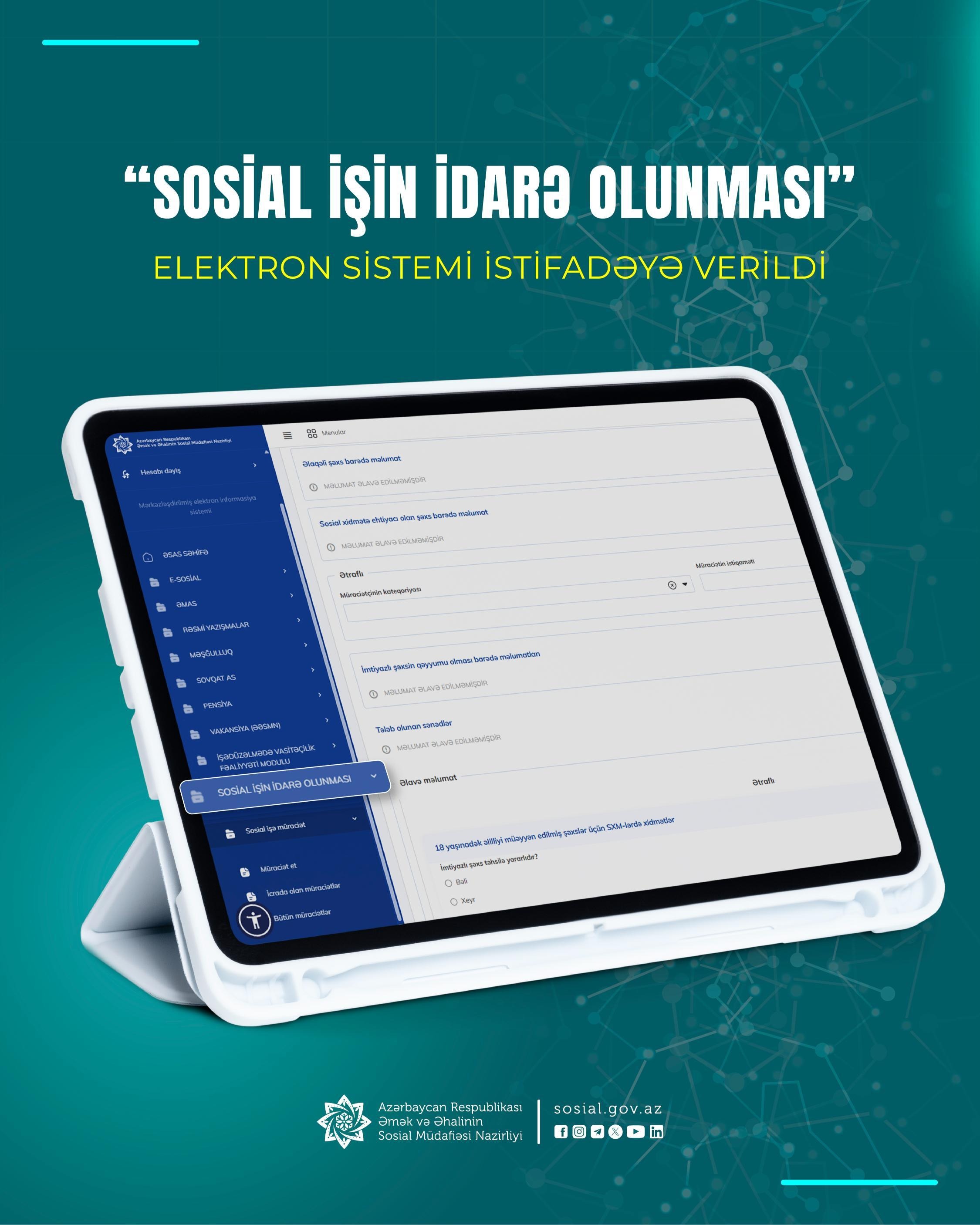 Bildirilib ki, yeni e-sistem sosial xidmətlərin daha səmərəli və vahid yanaşma əsasında təşkili və bu xidmətlərə ehtiyac duyan şəxslər və ailələrlə aparılan sosial iş prosesinin optimallaşdırılması məqsədi daşıyır.