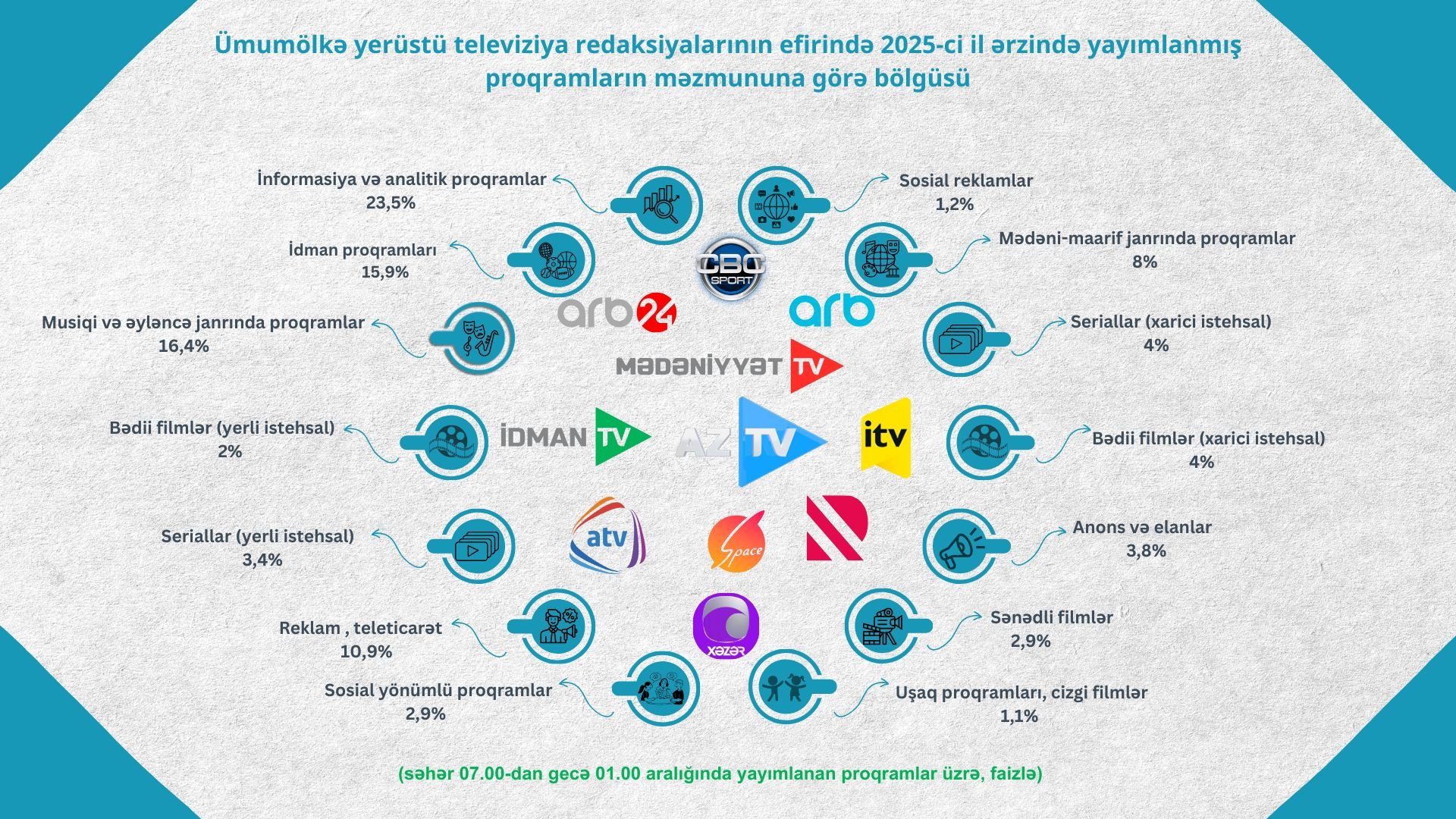 2025-ci il ərzində ümumölkə yerüstü televiziya kanallarında yayımlanmış proqramların məzmun-janr statistikası açıqlanıb.