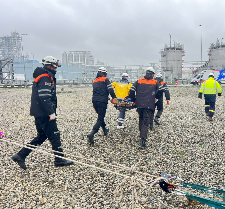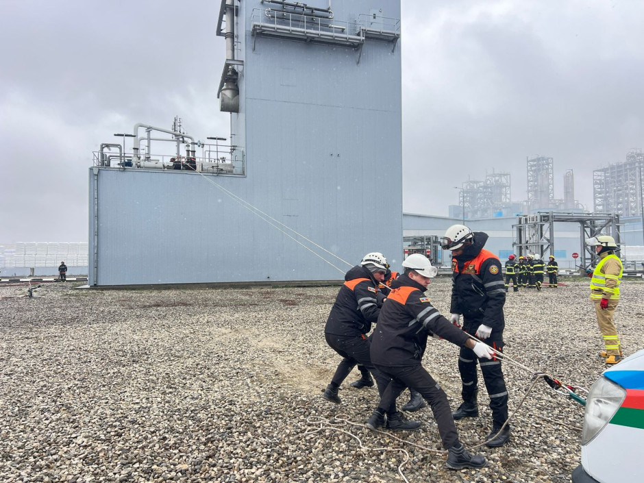 Təlim zamanı Polipropilen və Yüksəksıxlıqlı Polietilen zavodunda baş vermiş şərti yanğın yerinə operativ çatan FHN-in yanğın-xilasetmə qüvvələri tərəfindən işçilərin “təhlükəli ərazidən” təxliyə edilməsi, “yanğın” yerində çevik kəşfiyyatın aparılması və “yanğının söndürülməsi”, “yaralıların xilas edilməsi” əməliyyatları yerinə yetirilib.