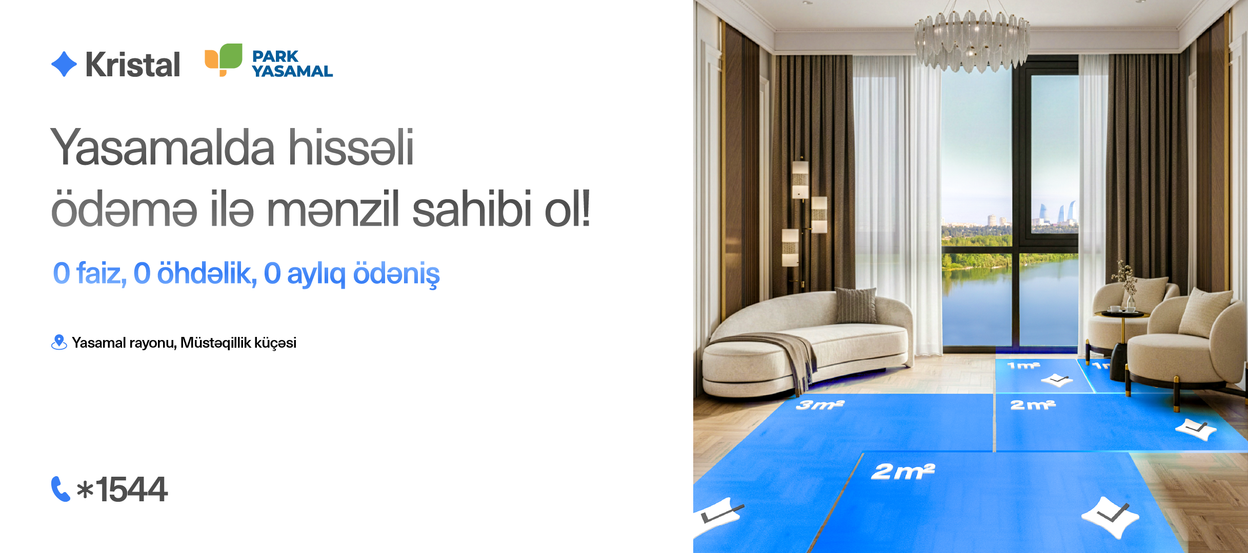 Yasamalda hissəli alışla ev sahibi olmaq üçün layihənin satış ofisinə yaxınlaşa və ya *1544 nömrəsinə zəng edə bilərsən.