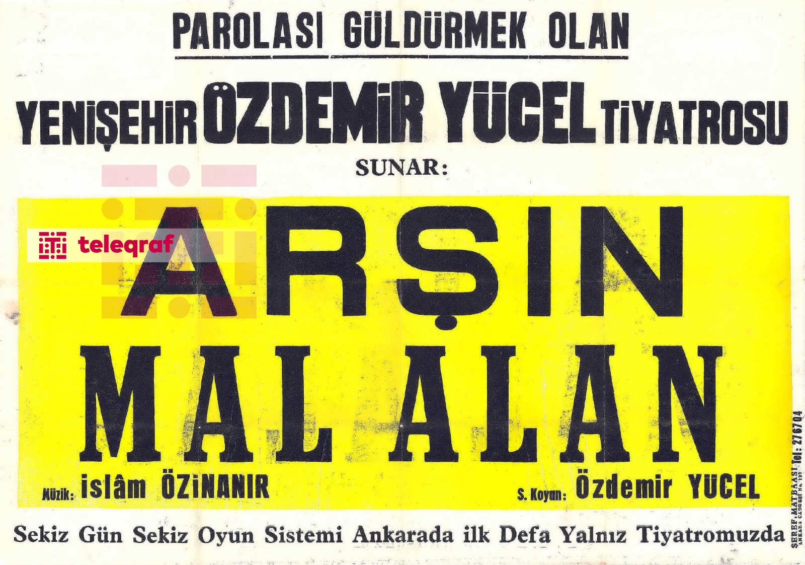 Türkiyə milli kitabxanasının arxivində yer alan bir afişadan bəlli olur ki, Yenişehir Özdemir Yücel teatrında Üzeyir bəy Hacıbəylinin “Arşın mal alan” əsəri oynanılıb. Operettanı səhnəyə qoyan Özdemir Yücel, musiqisini hazırlayan isə İslam Özinanır olub.
