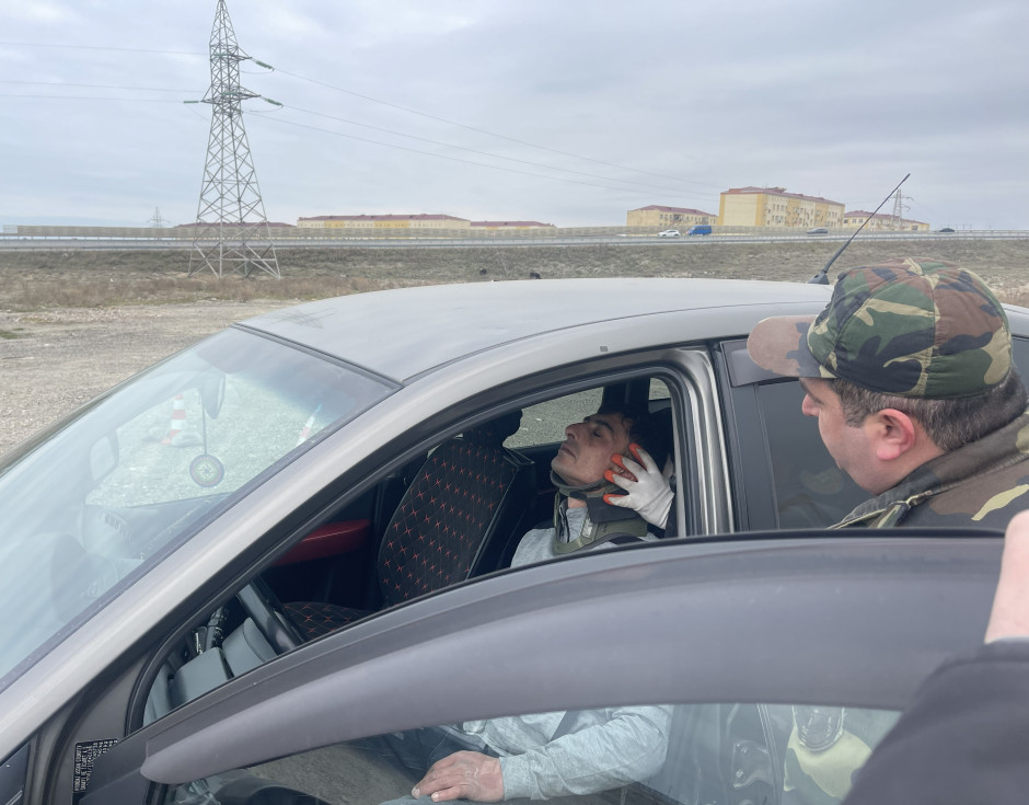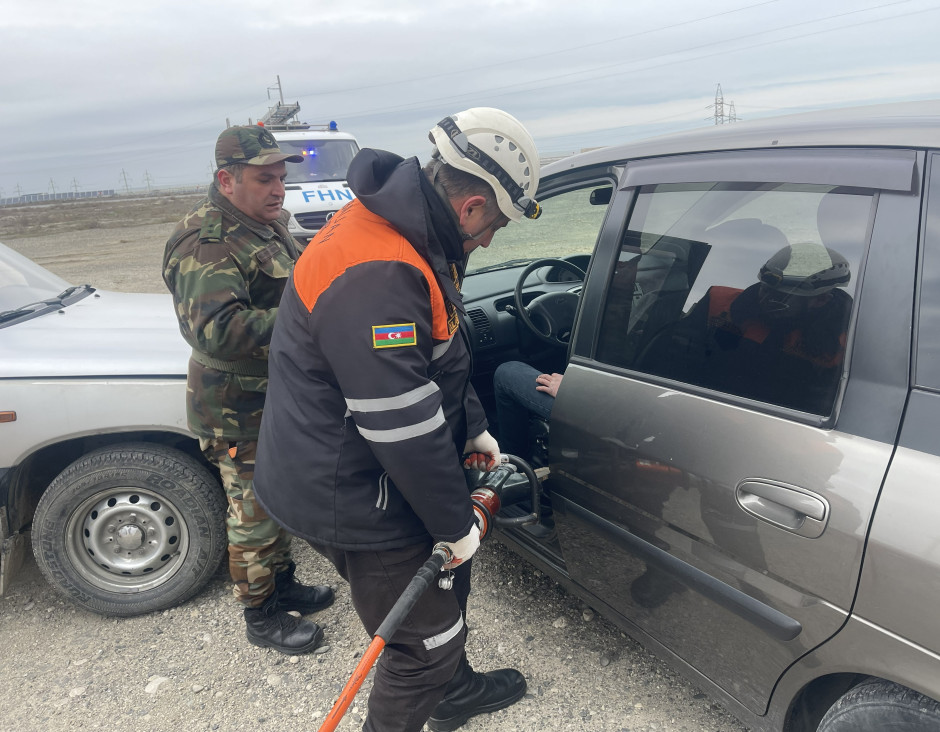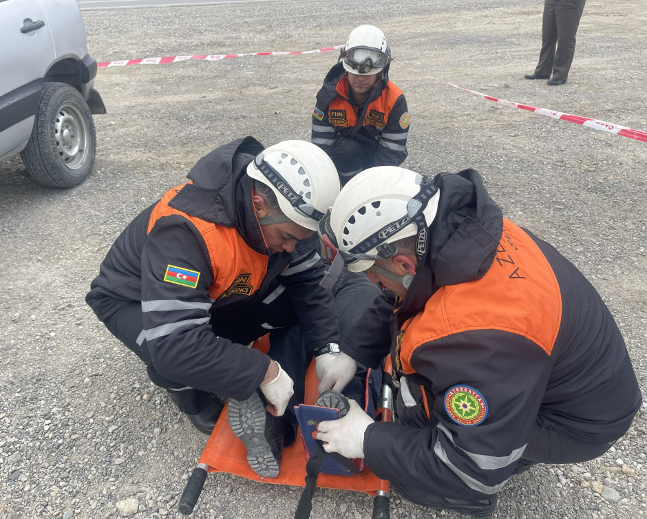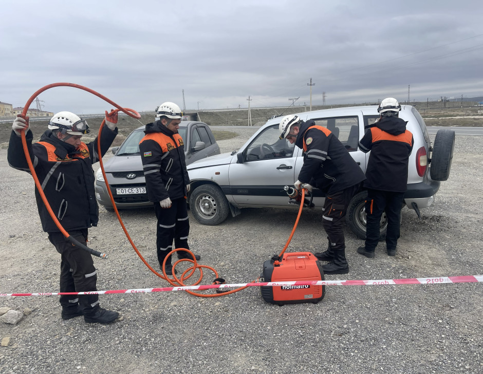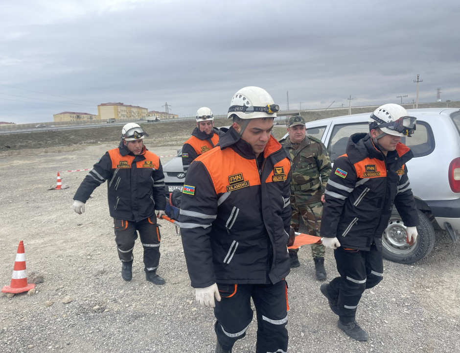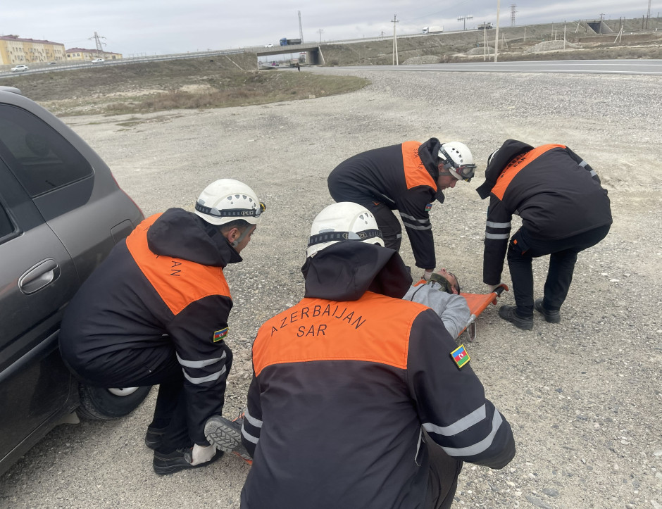 Təlim zamanı şərti olaraq baş vermiş nəqliyyat qəzası ilə əlaqədar “hadisə yerinə” operativ çatan xilasedicilər xüsusi xilasetmə vasitələrindən istifadə etməklə deformasiyaya uğramış avtomobildən “zərərçəkmişləri xilas edərək” onlara “təxirəsalınmaz ilkin yardım göstəriblər”.