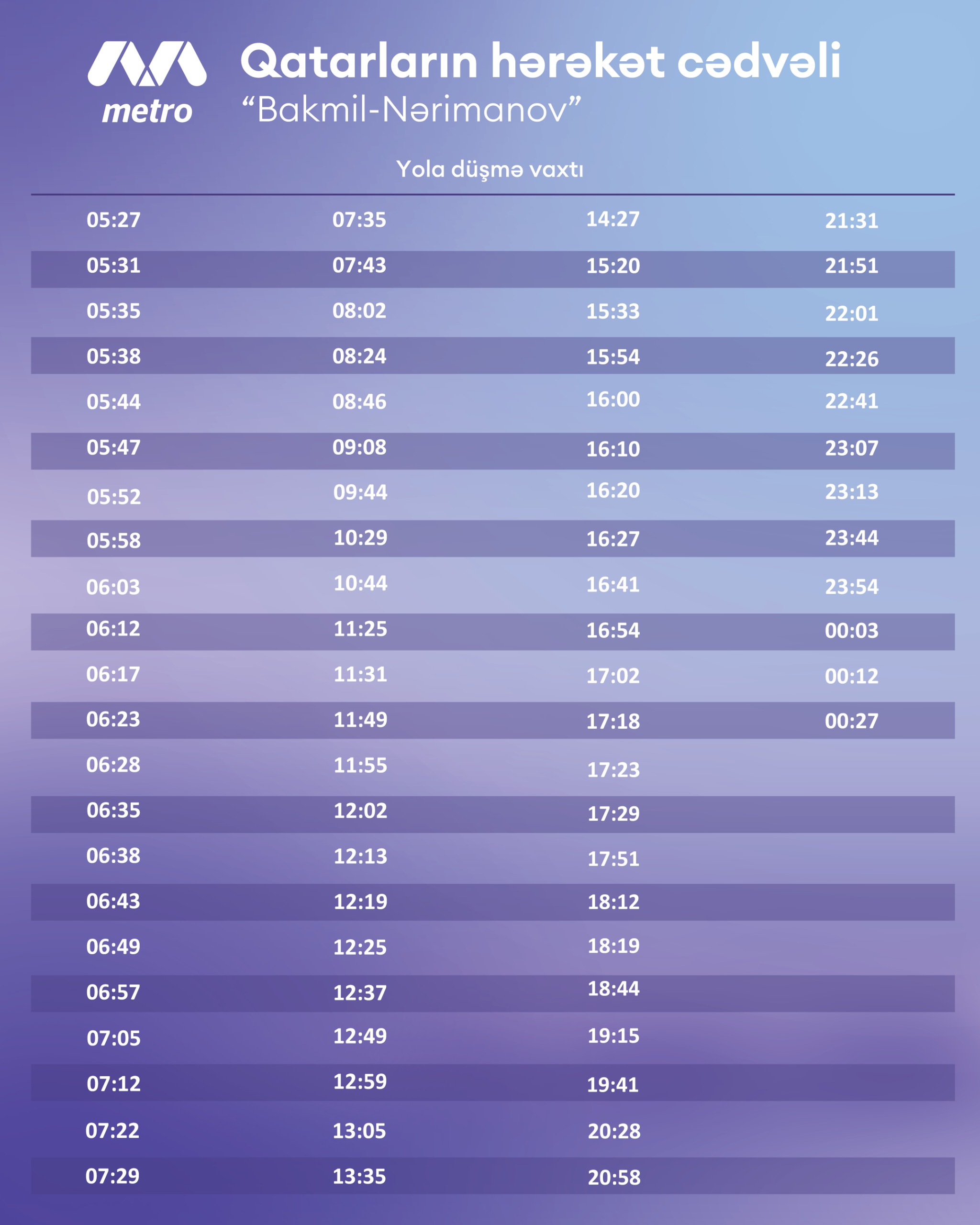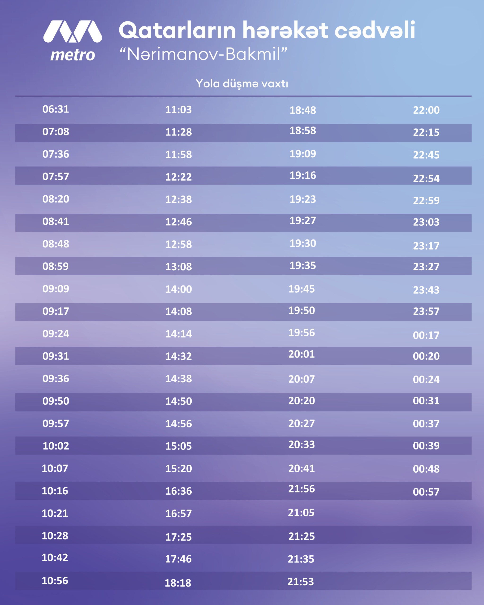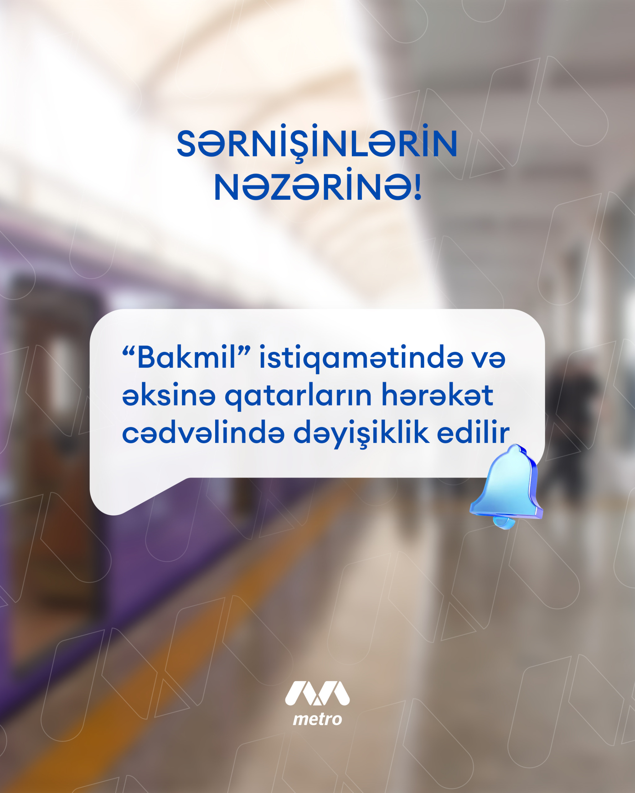 "Odur ki, martın 4-dən “Bakmil” stansiyasına və əks istiqamətə qatarların hərəkət cədvəlinə dəyişikliklər tətbiq edilir. Sınaq müddətində “Nərimanov– Bakmil” sahəsində hərəkət edən sərnişinlər üçün yenilənmiş qrafik təqdim olunur.