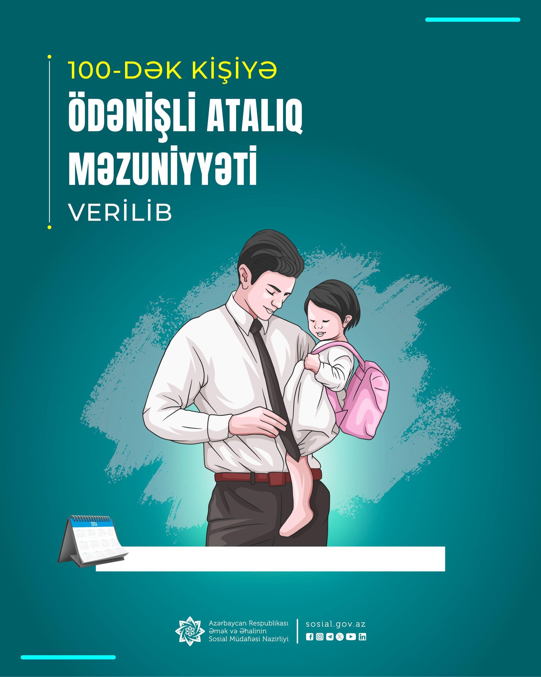 "İşçiyə ödənişli atalıq məzuniyyətinin verilməsi barədə əmr işəgötürən tərəfindən Əmək və Əhalinin Sosial Müdafiəsi Nazirliyinin “Əmək və Məşğulluq” altsistemində (ƏMAS) e-qaydada formalaşdırılır. Bu məqsədlə cari ilin yanvar ayında ƏMAS-da yeni funksionallıq tətbiq edilib", - məlumatda vurğulanıb.