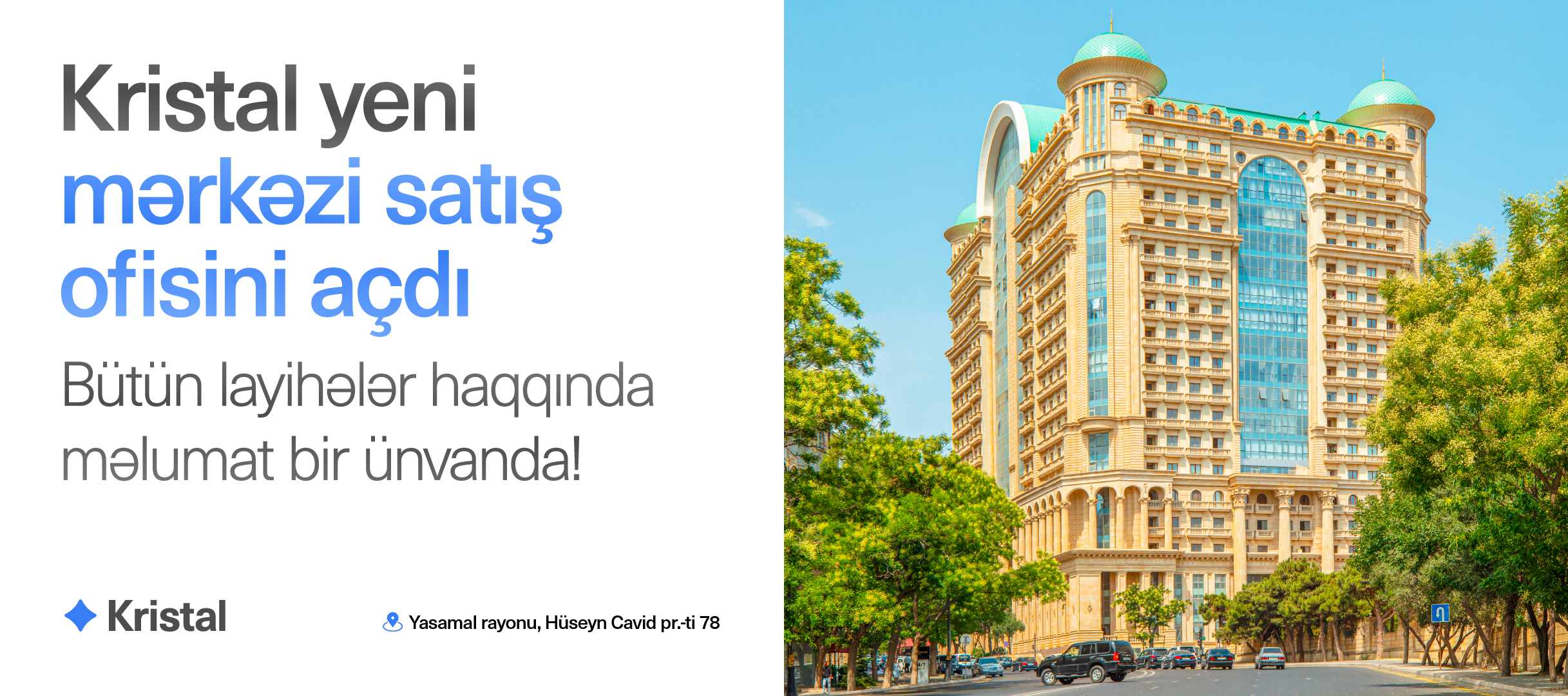 Xüsusilə qeyd etmək lazımdır ki, “Kristal”ın yeni açılmış mərkəzi satış ofisi artıq fəaliyyətə başlayıb. “Elmlər” ərazisində, “Merida Premium” layihəsində yerləşən bu ofisdə şirkətin bütün layihələri bir məkanda təqdim olunur. Müştərilər burada müxtəlif ərazilərdə yerləşən komplekslər, mənzil planları, qiymətlər və satış şərtləri ilə rahat şəkildə tanış ola, özləri üçün ən uyğun variantı müqayisəli şəkildə seçə bilərlər. Bu isə vaxt itkisini minimuma endirərək qərar vermə prosesini xeyli asanlaşdırır.