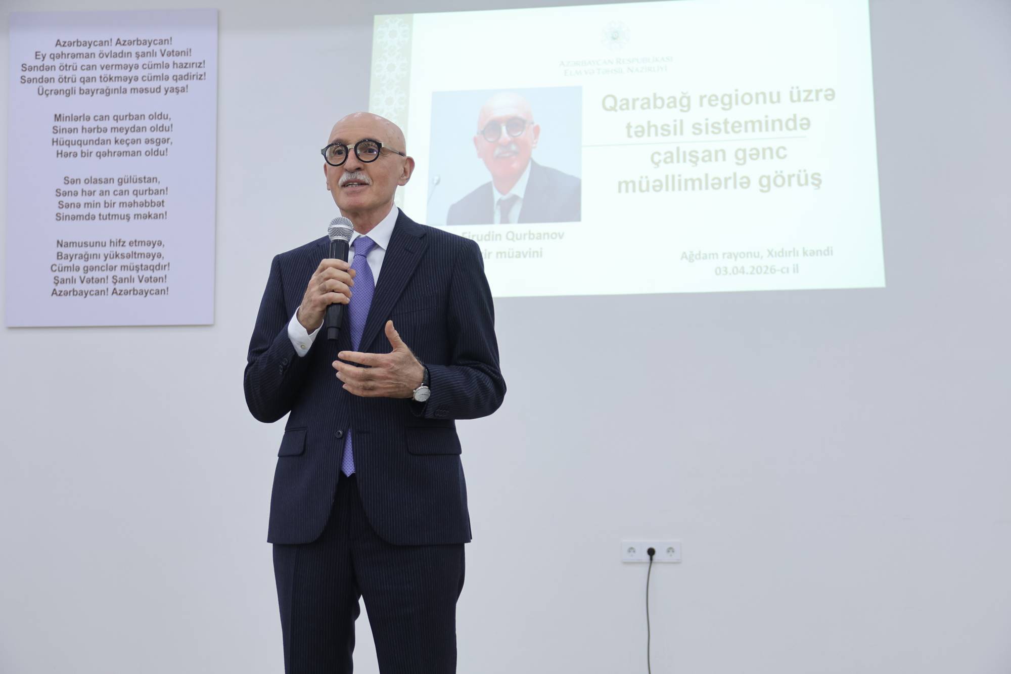 Ağdam rayonuna səfərin davamında Qarabağ Regional Təhsil İdarəsinin tabeliyində fəaliyyət göstərən ümumi təhsil müəssisələrində çalışan gənc müəllimlərlə görüş keçirilib. Görüşdə sözügedən region üzrə çalışan məktəb direktorları da iştirak ediblər. Görüş zamanı təhsilin keyfiyyətinin yüksəldilməsi, müəllimlərin peşəkar inkişafının dəstəklənməsi, müasir tədris metodlarının tətbiqi və innovativ yanaşmaların genişləndirilməsi məsələləri müzakirə olunub.