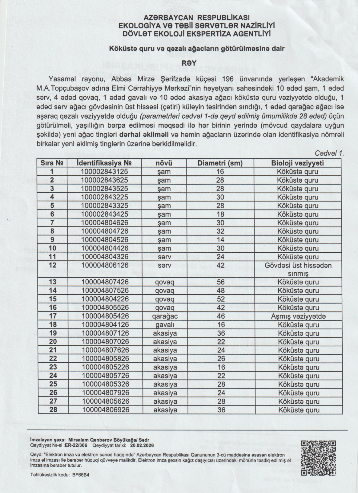 "Ağacların götürülməsi Ekologiya və Təbii Sərvətlər Nazirliyinin Dövlət Ekoloji Ekspertiza Agentliyi tərəfindən verilmiş rəy və müvafiq komissiya qərarları əsasında aparılıb. Bu barədə rəy, protokollar, yaşıllıqların götürülməsi üzrə komissiyanın qərarı və foto materiallar mövcuddur.