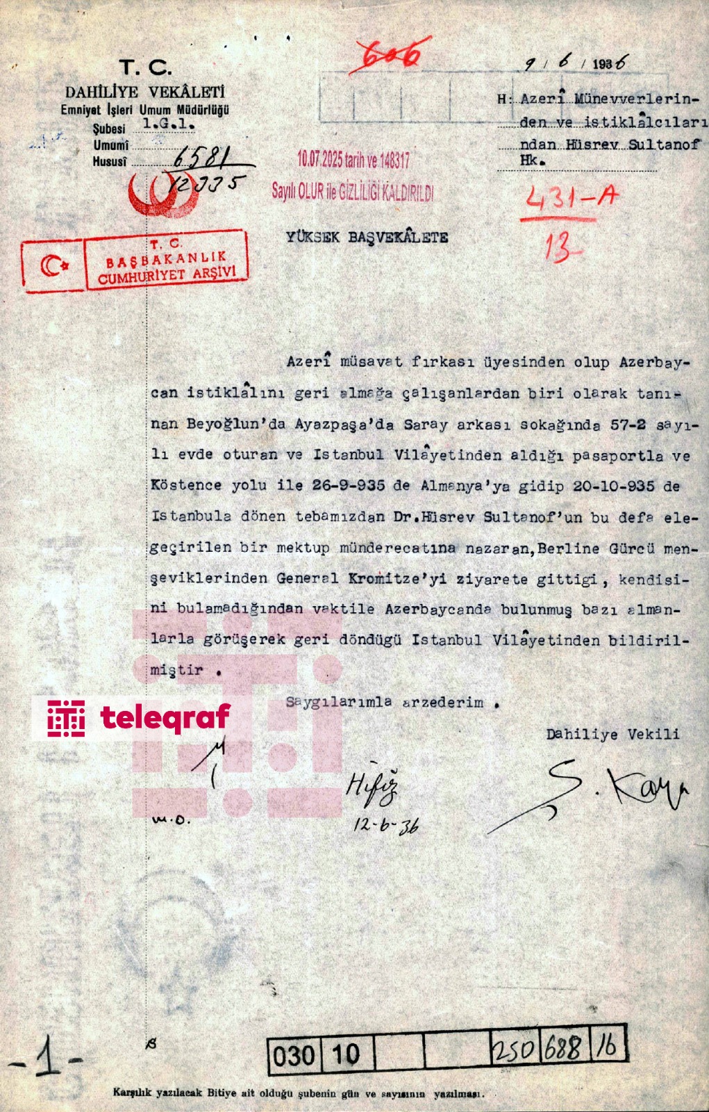 “Azərbaycan Müsavat Firqəsi üzvlərindən, Azərbaycanın istiqlalını geri qaytarmağa çalışanlardan biri kimi tanınan, Bəyoğlunda Ayazpaşada Sarayarxası küçəsindəki 57-2 saylı evdə yaşayan, İstanbul vilayətindən aldığı pasportla Konstansa yolu ilə 26.09.1935-ci ildə Almaniyaya gedib 20.10.1935-ci ildə İstanbula dönən təbəələrimizdən Dr. Xosrov Sultanovun bu dəfə ələ keçirilən bir məktubuna görə Berlinə gürcü menşeviklərindən general Kromitzeyi ziyarətə getdiyi, onu tapa bilmədiyi üçün vaxtilə Azərbaycanda olmuş bəzi almanlarla görüşərək geri qayıtdığı İstanbul vilayətindən bildirilmişdir”.