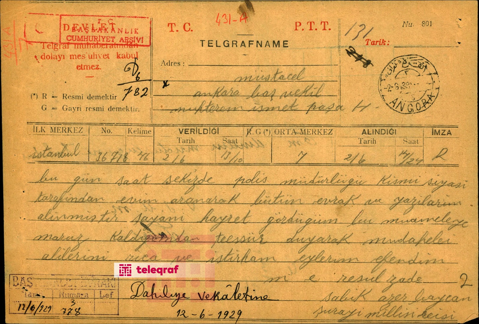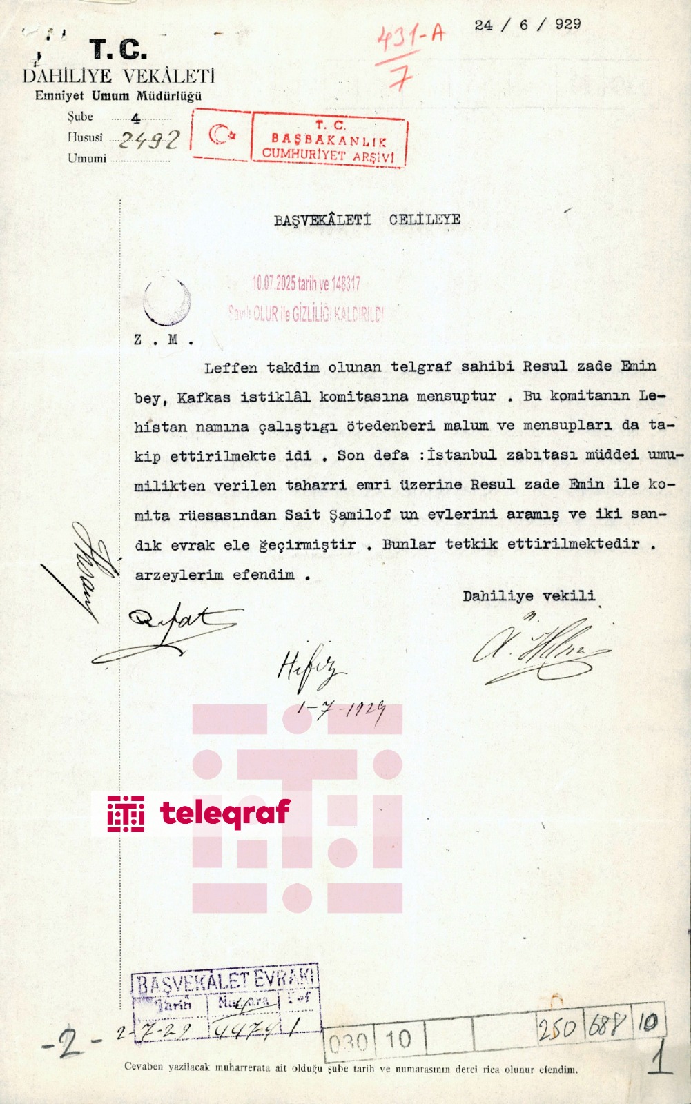 Evindəki axtarışdan təəssüflənən Rəsulzadə isə Daxiliyyə Vəkalətinə göndərdiyi 12 iyun 1929-cu il tarixli teleqramında yazıb: “Bu gün saat 8-də Polis Müdirliyi qismi-siyasi tərəfindən evimdə axtarış aparılaraq bütün əvraq və yazılarım götürülmüşdür. Şayani-heyrət gördüyüm bu müamiləyə məruz qaldığım üçün təəssür duyaraq müdafieyi-alilərimi rica və istirham eylərim, əfəndim. Məhəmmədəmin Rəsulzadə. Sabiq Azərbaycan Şurayi-milli rəisi”.