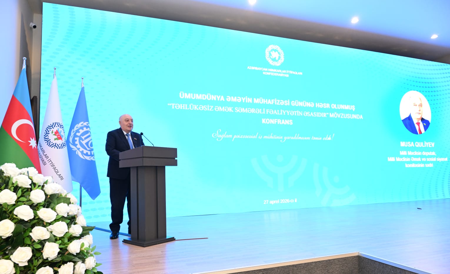 Milli Məclisin Əmək və sosial siyasət komitəsinin sədri, Konfederasiyanın Layiqli Əmək Səfiri Musa Quliyev ölkədə əməyin mühafizəsinə dair qanunvericilik bazasının müasir çağırışlara uyğun təkmilləşdirildiyini, normativ-hüquqi aktların işçilərin sağlamlığının qorunmasına və istehsalat risklərinin minimuma endirilməsinə xidmət etdiyini vurğulayıb.