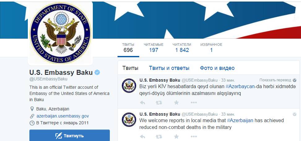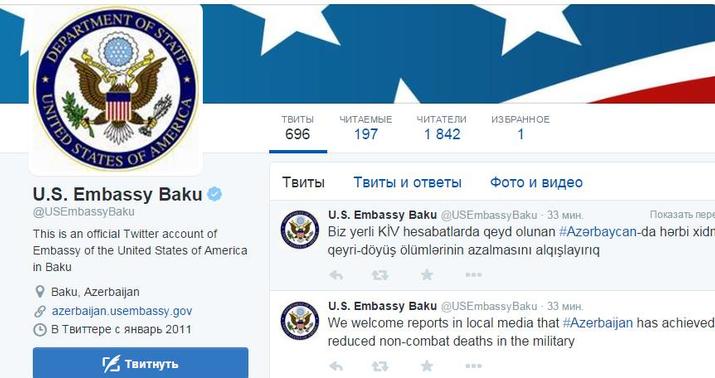 Teleqraf.com-un məlumatına görə, səfirlik rəsmi Twitter səhifəsində bu barədə qeyd edib: “Biz yerli KİV hesabatlarında qeyd olunan Azərbaycanda hərbi xidmətdə qeyri-döyüş ölümlərinin azalmasını alqışlayırıq”.
