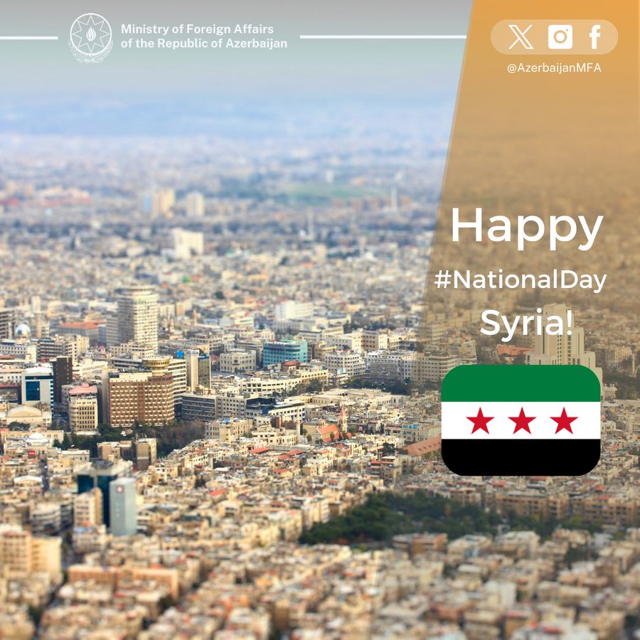 Azərbaycan Xarici İşlər Nazirliyi Suriyanı Milli Günü münasibətilə təbrik edib.