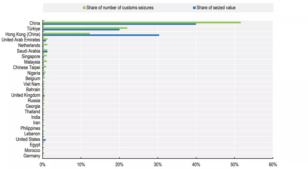 İqtisadi Əməkdaşlıq və İnkişaf Təşkilatının (OECD) hesabatına əsasən, Avropa İttifaqı (Aİ) ölkələrinə göndərilən saxta malların həcminə görə Çindən sonra Türkiyə ikinci yeri paylaşır.