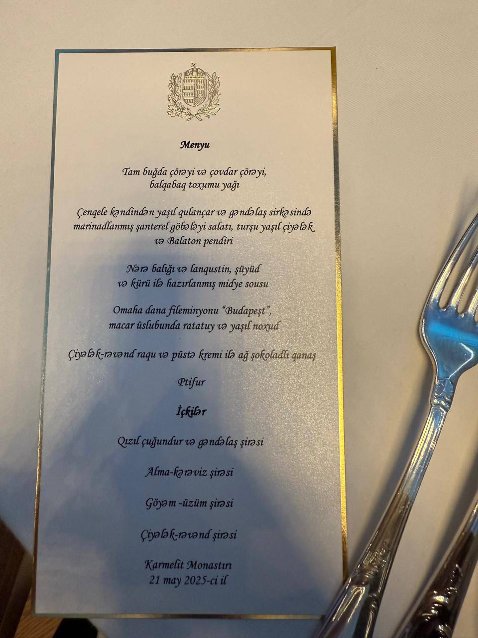 Menyuda tam buğda çörəyi, çovdar çörəyi balqabaq toxumu yağı ilə birgə təqdim edilir. Soyuq qəlyanaltı bölməsində isə Çenqele kəndindən yaşıl qulançar, gəndalaş sirkəsində marinə edilmiş şanterel göbələyi salatı, turş yaşıl çiyələk və Balaton pendiri təklif olunur. Əsas yemək bölməsində nərə balığı və lanqustin, şüyüd və kürü ilə hazırlanmış midyə sousu, “Budapeşt” Omaha dana fileminyonu, macar üslubunda ratatuy ilə yaşıl noxud yer alır. Lançda desert kimi çiyələk-rəvənd raqu və pista kremi ilə ağ şokolad qanaş nəzərdə tutulur.