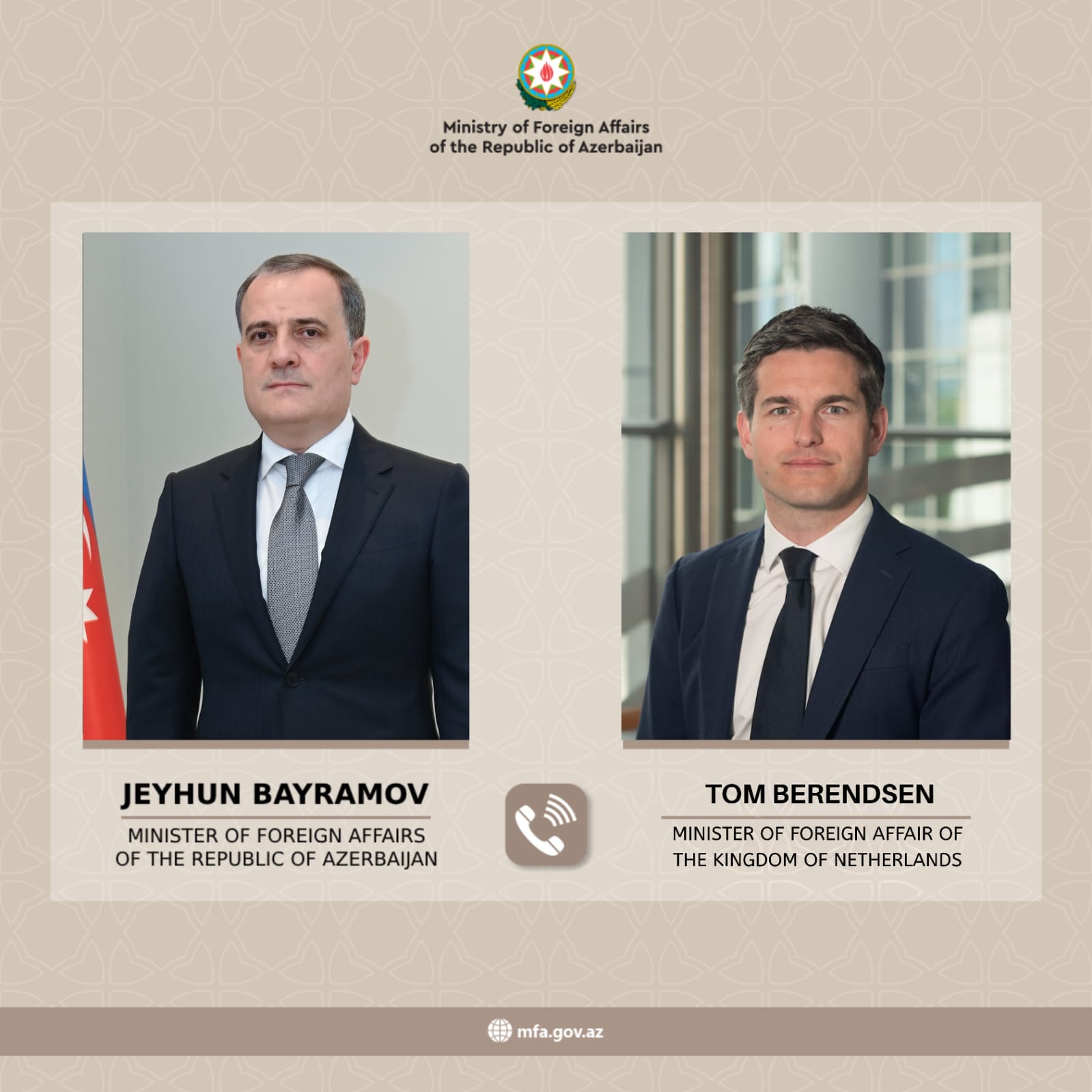 Bu gün Niderlandın xarici işlər naziri Tom Berendsen Azərbaycanın xarici işlər naziri Ceyhun Bayramova zəng vurub.