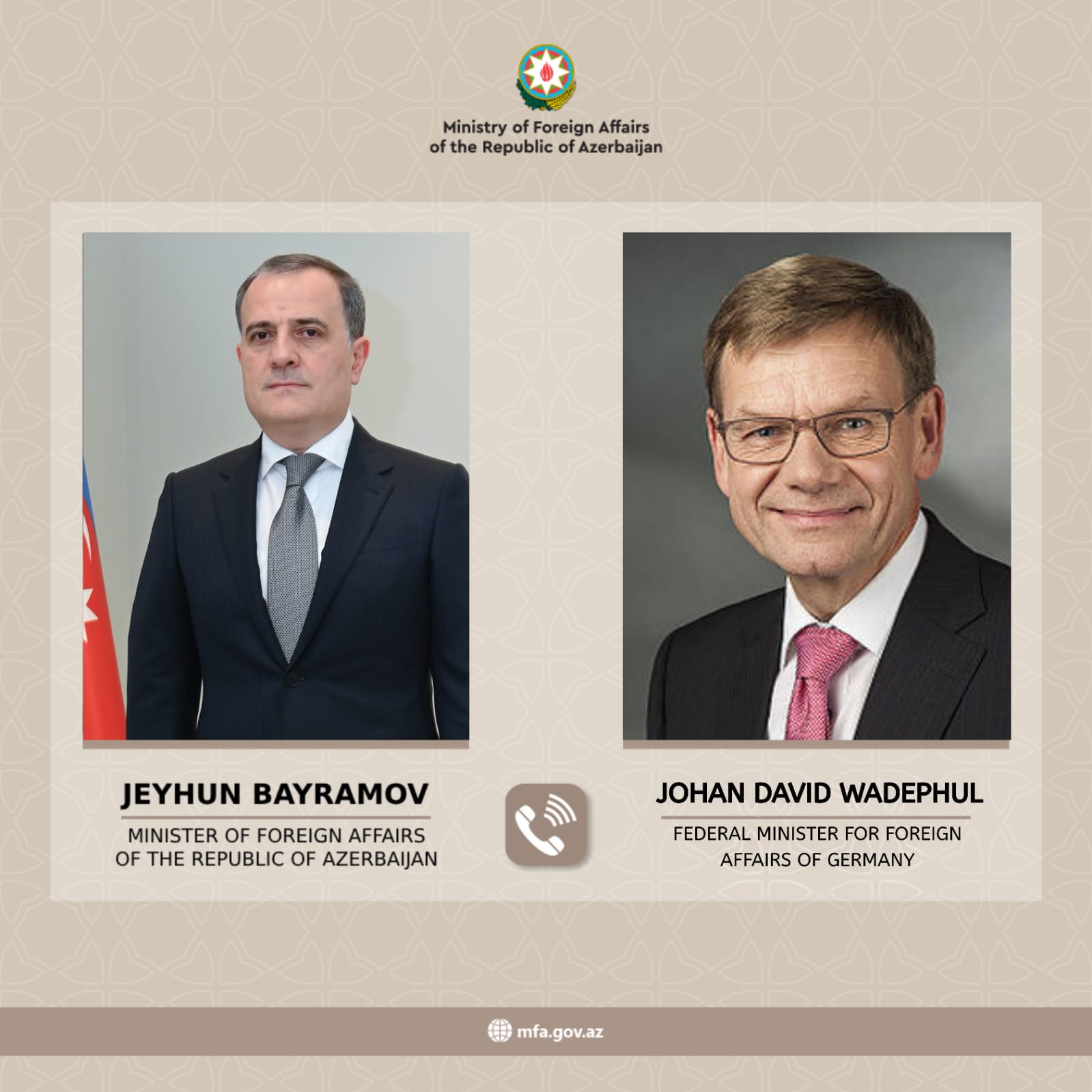 Almaniya Federativ Respublikasının xarici işlər naziri Yohan David Vadeful Azərbaycanın xarici işlər naziri Ceyhun Bayramova zəng vurub.