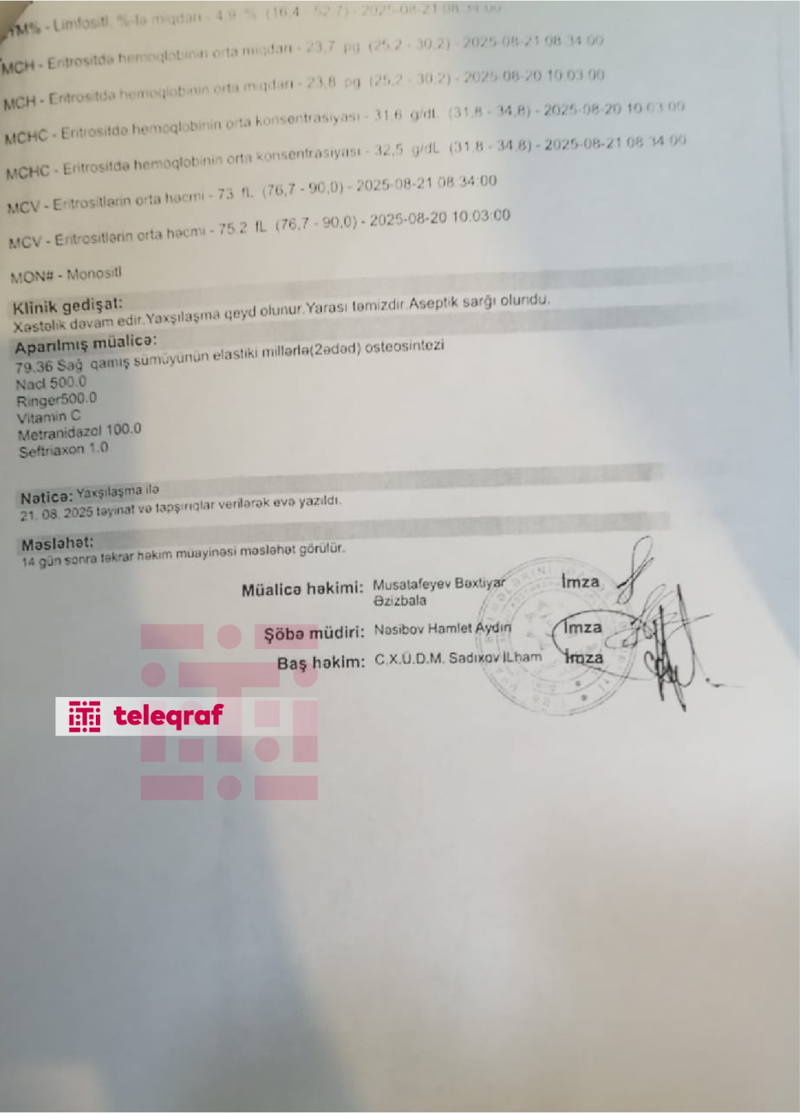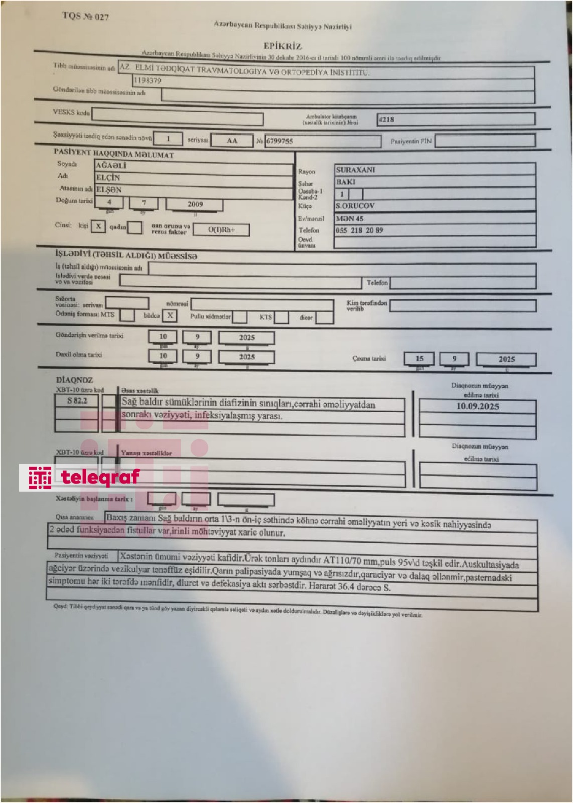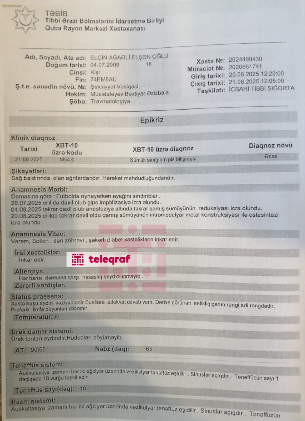 Əfqan Əliyev deyib ki, 2025-ci ilin dekabrın 8-də Elmi Tədqiqat və Travmatologiya İnstitutundan nəvəsinin sağ ayağının yenidən rentgenoqrafiya edilib, həmin sənədə əsasən verilmiş arayışda ətraflı qeydiyyat aparılıb, nəvəsinin vəziyyəti orta-ağır qiymətləndirilib: “Yerimək məhdudiyyəti olduğu, vəziyyətinin orta-ağır olduğu üçün yenidən 6 ay təhsildən uzaqlaşdırılıb, ev təhsilinə yönləndirilib. Bu da o deməkdir ki, nəvəm Elçin 12 ay Nurəddin tərəfindən qəsdən törədilmiş əməlin əzab-əziyyətini çəkməlidir. Elçin iki dəfə əməliyyat olunub. Quba xəstəxanasında baldırındakı sınıqlara mil qoyulub. 6 ayda bundan sonra ev şəraitində müalicəsi davam etdiriləcək”.