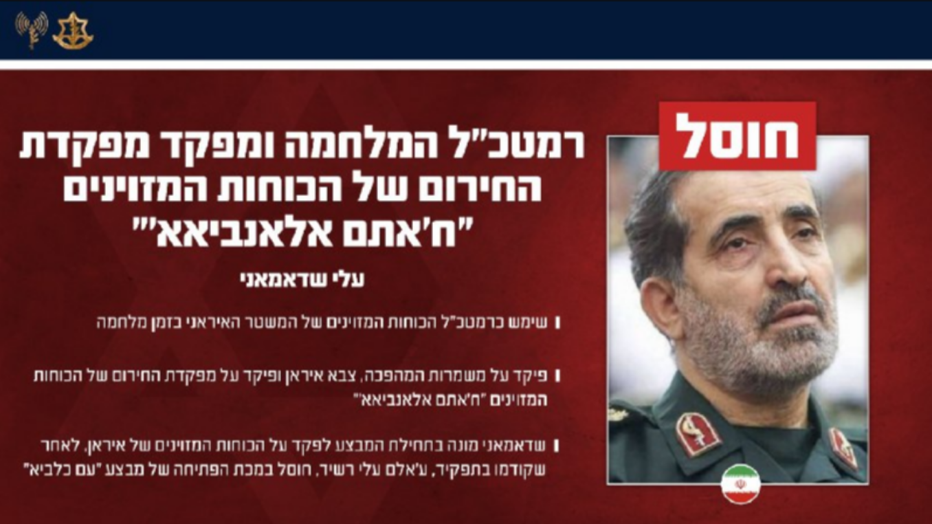 İsrail Müdafiə Qüvvələri İranın ali rəhbəri Əli Xameneinin Hərbi Qərargahının rəisi general-mayor Əli Şadmanini sıradan çıxarıb.