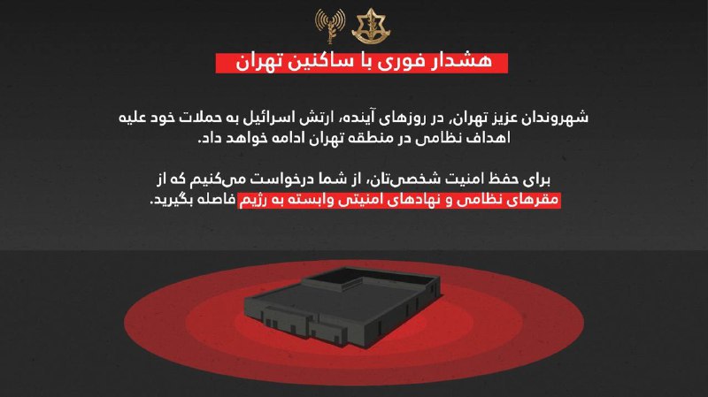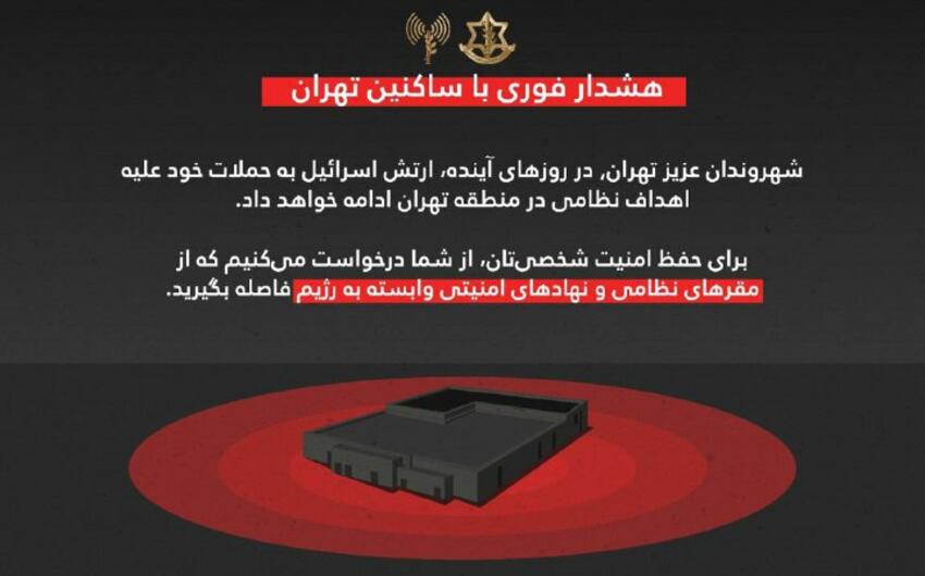 İsrail Müdafiə Qüvvələri (İDF) fars dilində Tehran sakinlərinə müraciət edərək yaxın günlərdə İranda hərbi hədəflərə qarşı hücumların davam edəcəyini bildirib.