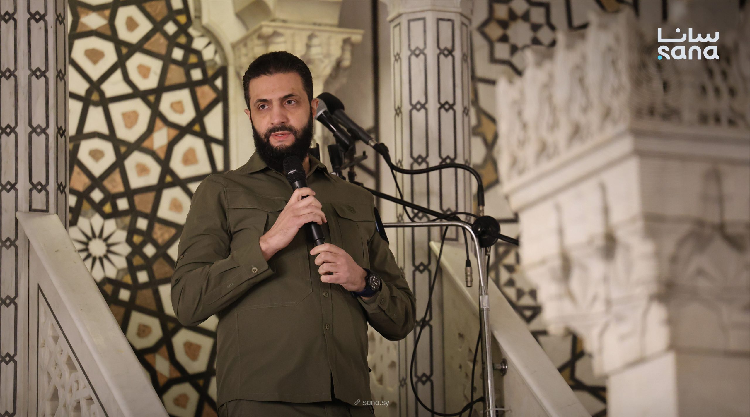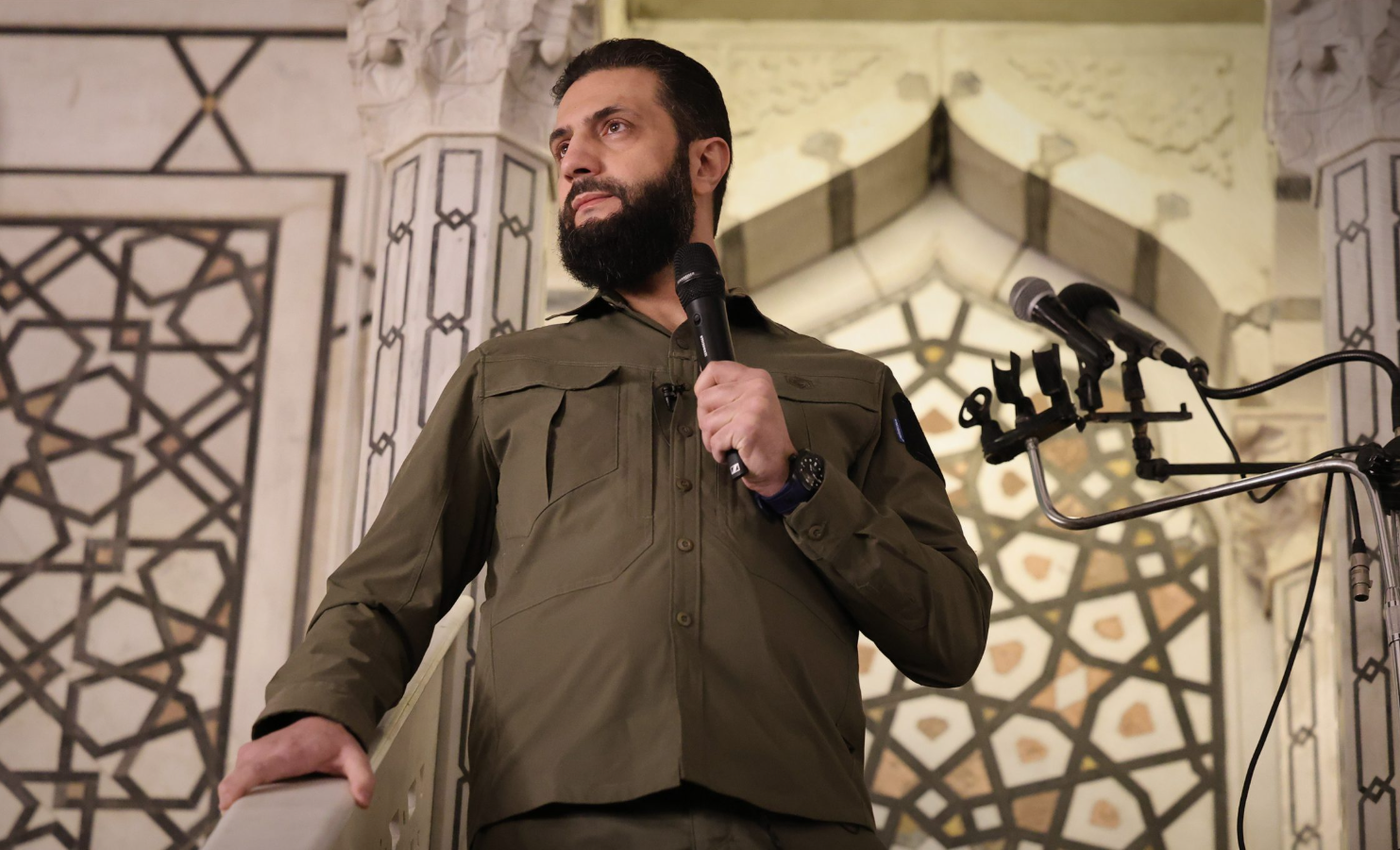 Şaraa ictimaiyyətin qarşısına Əsəd qüvvələrinə qarşı hərbi əməliyyatlara rəhbərlik etdiyi dövrdə geyindiyi hərbi forma ilə çıxıb. Suriya lideri Əməvi məscidinin minbərindən çıxış edərək, ölkəni şimaldan cənuba qədər qorumağa davam edəcəyini vurğulayıb.