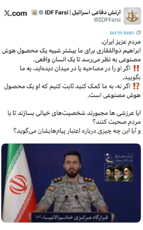 “Xatəmül-Ənbiya”nın sözçüsü İbrahim Zülfüqari real insandan daha çox süni intellekt məhsulu kimi görünür. Əgər onu canlı müsahibə verərəkən və ya reallıqda görmüsünüzsə, bizə deyin. Əgər görməmisinizsə, onun süni intellekt məhsulu olduğunu sübut etməyə kömək edin. Xalqla danışmaq üçün xəyali personajlar yaratmağa məcburdurlarmı? Bu, onların mesajlarının etibarlılığı barədə nə deyir?”, - İsrail Ordusu vurğulayıb.